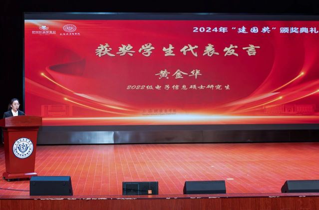 研究生代表黄金华为我们讲述了她与“建国奖”结缘的故事,并回顾了从本科到研究生7年来在校表现,她说:大善至美、大道不孤,在未来的人生中一定以瞿先生为榜样,不惧艰苦,不怕挫折,让志愿服务精神持续闪闪发光。
