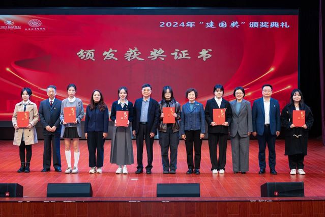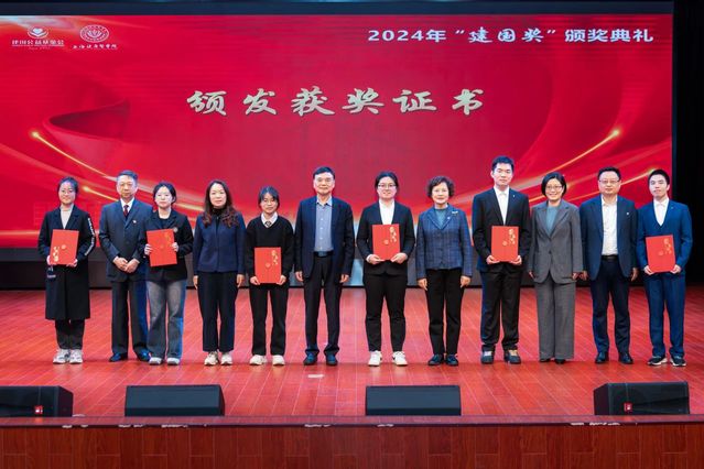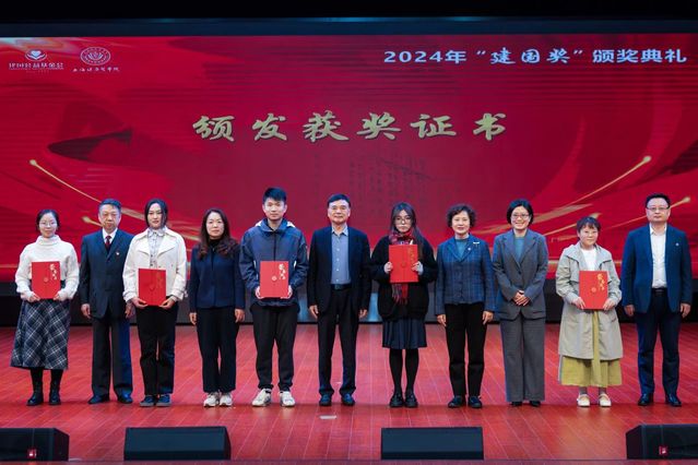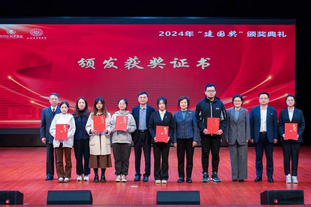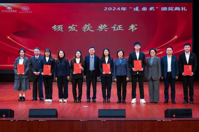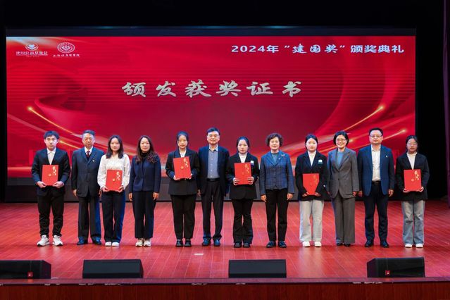 初冬暖阳,2024年11月21日下午,上海健康医学院教育发展基金会(以下简称教育发展基金会)在上海健康医学院北苑400人报告厅隆重举行“建国荣耀伴启航,健康使命勇担当”2024年“建国奖”颁奖典礼。学校党委副书记、副校长唐红梅;上海市建国社会公益基金会(以下简称建国基金会)、原能细胞科技集团有限公司创始人,开能健康科技集团股份有限公司、上海原能细胞生物低温设备有限公司董事长,教育发展基金会创始理事瞿建国;建国基金会秘书长、原能细胞科技集团董事长庄乾坤;理事长张正苹;党支部书记沈福伟;魏艺曼女士;校党委常委、宣传部部长、教育发展基金会理事长李兆伟;校友工作办公室副主任、校友会秘书长、教育发展基金会秘书长王红、研究生管理办公室主任胡霞敏;学生处副处长于杨等及获奖学生参加颁奖典礼。
