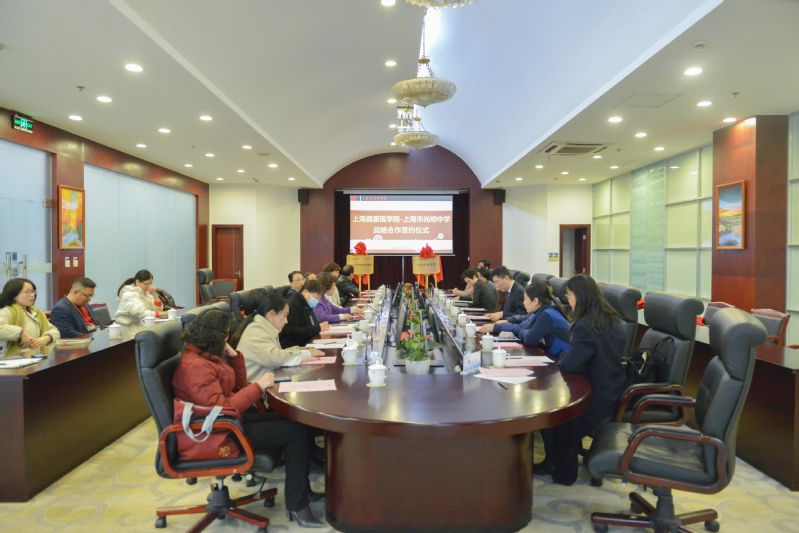 上海市光明中学党支部书记兼副校长邬雪洁,校长穆晓炯,副校长黄琼、钟浩,上海市教卫工作党委二级巡视员杨伟人(主持学校党委工作),上海健康医学院党委副书记、校长黄钢,以及双方主要职能部门负责人出席签约仪式,仪式由上海健康医学院副校长唐红梅主持,健康与公共卫生学院副院长陈新对合作项目进行了介绍。
