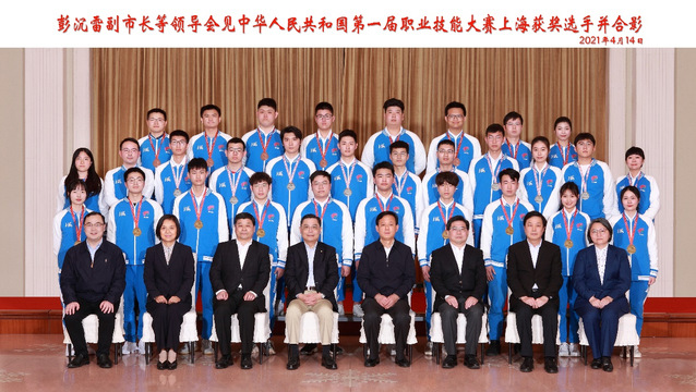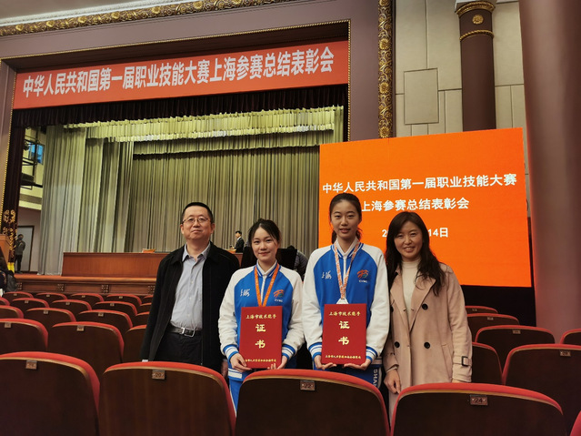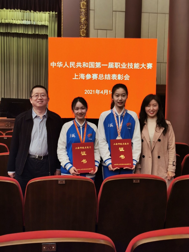 2021年4月14日,中华人民共和国第一届职业技能大赛(简称首届全国技能大赛)上海参赛总结表彰会在上海展览中心友谊会堂举行。我校健康和社会照护项目基地代表朱爱勇院长、徐淑芹教练组长以及两位获奖选手吴怡欣、林秀怡前去参加此次表彰会。