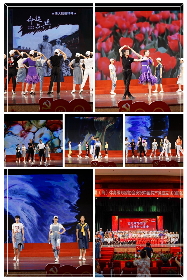 随后,凌老师就上半年社团开展的情况以及队员们在上海市退(离)休高级专家协会庆祝建党百年华诞文艺演出中的精彩表演给予高度评价,并对退休教师为学校争光添彩、积极宣传学校的责任感给予与赞扬。2021年7月10 下午,上海市退(离)休高级专家协会庆祝建党百年文艺演出在上海邮电俱乐部隆重举行,我校时装表演社团时装表演《宅家抗疫》压轴出演,随着活力而有节奏感的音乐响起,由22位退休老师组成的服饰表演队精彩亮相,富有青春活力的7人组合、6人组合、4人组合的队形展示令人目不暇接;紧接着,现场舞台蒙古舞和背投视频中武汉方舱医院为增强感染病人提高免疫力的集体蒙古舞交相呼应的场景令人感动;最后是节目创编者解军老师和友情出演的任建平老师舞蹈柔情伦巴“万水千山总是情”,最后,全体表演人员面向背投大屏幕,聆听习近平总书记“平凡铸就伟大、英雄来自人民、每个人都了不起”。音乐再次响起,全体表演人员走向观众席环场谢幕。整个节目主题鲜明、一气呵成、音乐和舞台背景视频契合完美,演员表演动感流畅有活力,得到观众的多次热烈掌声喝彩!