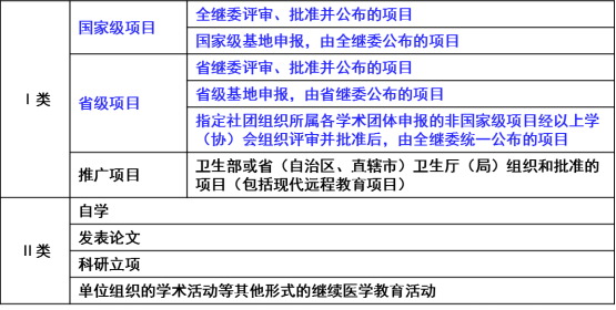 凡能获得继续医学教育规定学分的继续医学教育活动统称为继续医学教育项目。按项目活动性质,学分分为I类学分和II类学分。继续医学教育项目申报须符合卫生人才培养的需求,以现代医学科学技术发展中的新理论、新知识、新技能和新方法,着重突出针对性、实用性和先进性的特点。医疗卫生、教学、科研机构可按申报流程申报国家级(上海市级)继续医学教育项目,其他机构须经全国继续医学教育委员会(上继委)批准获得申报资格才可申报。