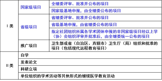 凡能获得继续医学教育规定学分的继续医学教育活动统称为继续医学教育项目。按项目活动性质,学分分为I类学分和II类学分。继续医学教育项目申报须符合卫生人才培养的需求,以现代医学科学技术发展中的新理论、新知识、新技能和新方法,着重突出针对性、实用性和先进性的特点。医疗卫生、教学、科研机构可按申报流程申报国家级(上海市级)继续医学教育项目,其他机构须经全国继续医学教育委员会(上继委)批准获得申报资格才可申报。