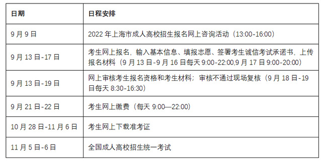 2022年上海市成人高校考试日程安排
