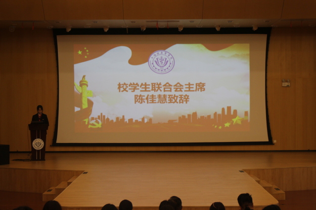 校学生联合会主席团成员陈佳慧致辞,希望新一届学生会主席团继续与校学生会密切配合,通力合作,争创佳绩。