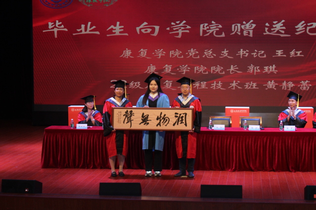 学子献墨寄深情,润物无声谢师恩。22级康复工程技术班毕业生代表黄静蕾向学院领导王红书记和郭琪院长赠送了题为润物无声的书法作品。这份饱含深情的礼物,既展现了同学们的传统文化素养,也寄托着他们对学院未来发展的美好祝愿。
