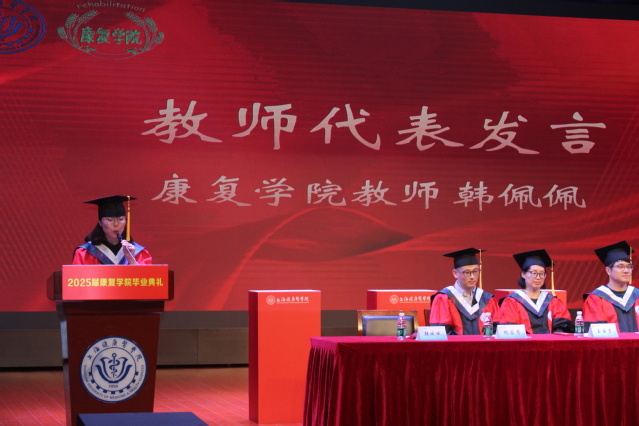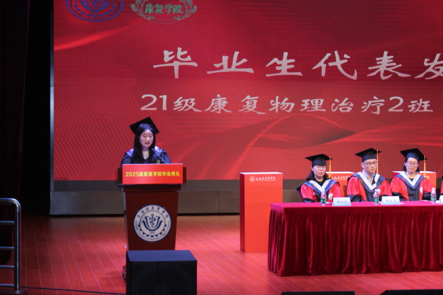 教师代表韩佩佩以“道在途中,功在恒久”为寄语,希望毕业生们深耕康复专业,精雕细琢,终有所成。同时送上三句箴言:愿毕业生们踏实耕耘,以真诚为舟,在专业实践与团队协作中赢得尊重;愿他们守住本心,不为外界喧嚣所扰,遵循自己的成长节奏;更愿毕业生们珍爱自己,无论前路如何,康复学院永远是他们坚实的后盾。