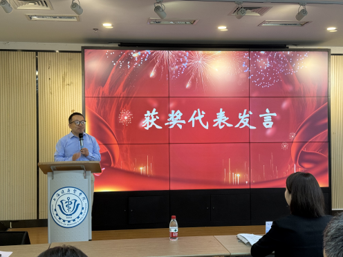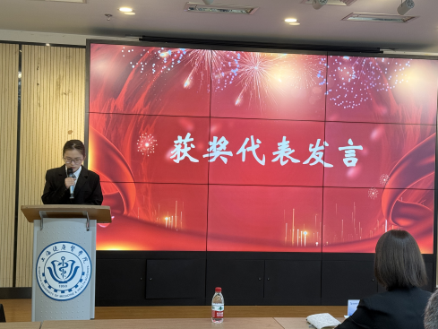 获奖教师代表梁贞文发言。他列举了院校合作以来上海赫尔森康复医院对学院教学、科研和临床实践等多方面的发展中的鼎力支持,对于医院的无私帮助表示衷心的感谢,期待着未来医院和学校在临床教学、科研等方面有更加密切的合作,取得更好的成绩,为“健康中国”战略和全球康复事业贡献力量。