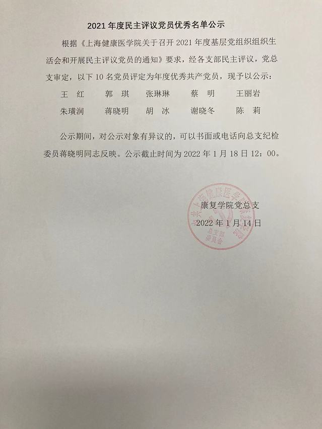 2021年度民主评议党员优秀名单公示