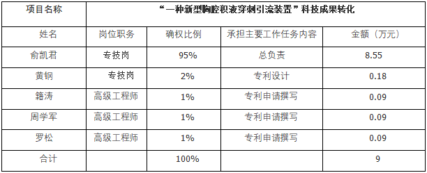根据《上海健康医学院科技成果转化管理办法》上健医科技[2023]14号规定,由专利第一发明人俞凯君提出奖励分配建议方案,科技处审议,现将“一种新型胸腔积液穿刺引流装置”项目成果转化收益奖励分配方案予以公示:
