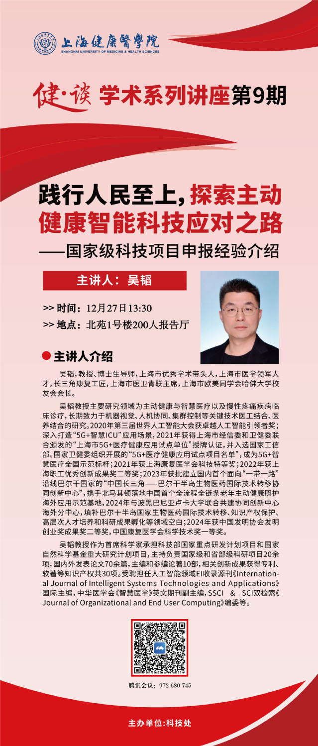 【健·谈】第9期学术系列讲座将于12月27日13:30在北苑1号楼200人报告厅举办,本期特邀吴韬校长作报告,报告主题是“践行人民至上,探索主动健康智能科技应对之路-国家级科技项目申报经验介绍”,欢迎大家前来参加!