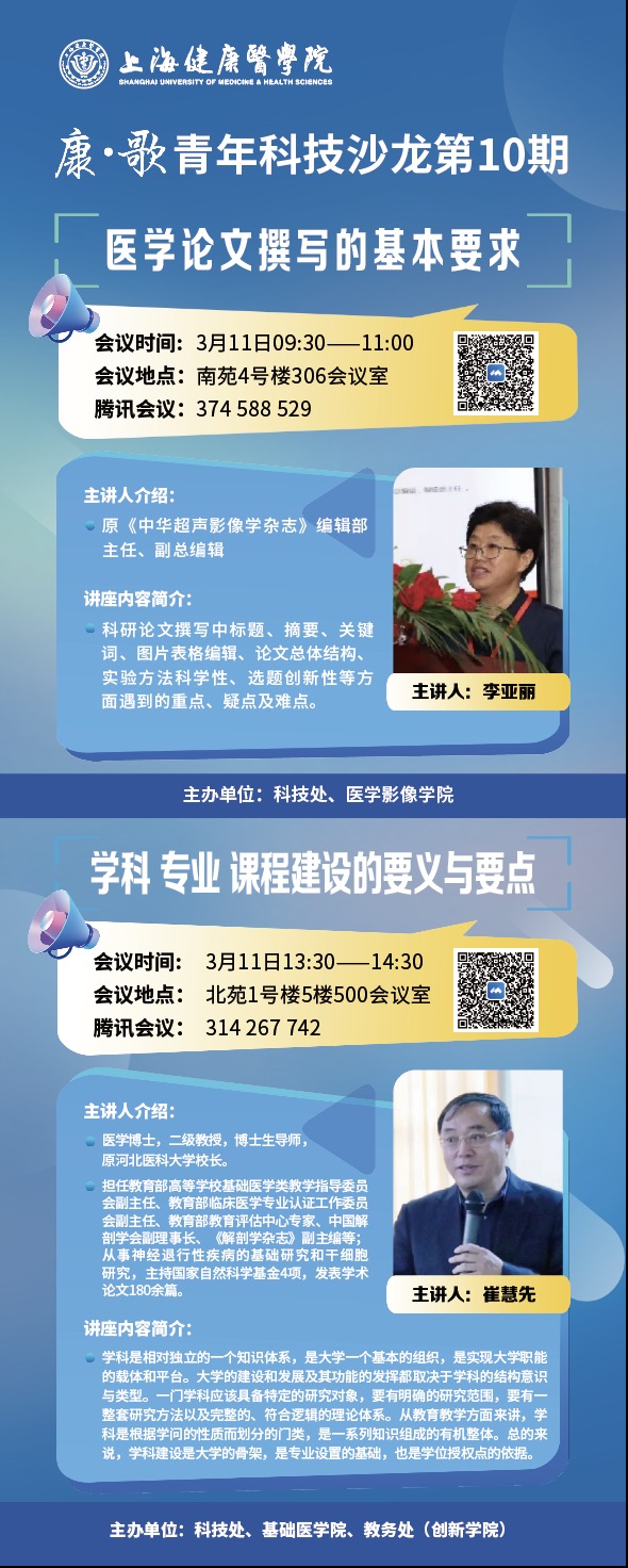 【康·歌】第10期青年科技沙龙将于3月11日举办,本期有上午和下午两场讲座。上午,特邀原《中华超声影像学杂志》编辑部主任、副总编辑李亚丽教授于09:30在南苑14号楼306室作主题为“医学论文撰写的基本要求”的报告,主要内容是关于科研论文撰写中标题、摘要、关键词、图片表格编辑、论文总体结构、实验方法科学性、选题创新性等方面遇到的重点、疑点及难点。下午,特邀原河北医科大学校长、教育部高等学校基础医学类教学指导委员会副主任于13:30在北苑1号楼5楼500会议室作题为“学科 专业 课程建设的要义与要点”的报告,报告是关于学科建设的相关内容。