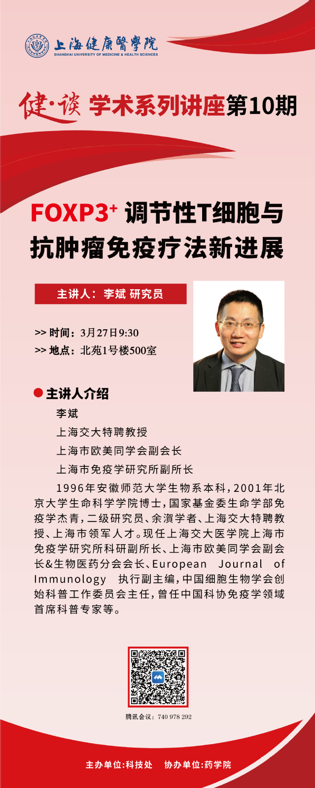 【健·谈】第10期学术系列讲座将于3月27日上午09:30在北苑1号楼500室举办,本期特邀上海交通大学特聘教授李斌作主题为“FOXP3+调节性T细胞与抗肿瘤免疫疗法新进展”的报告,欢迎大家前来参加!