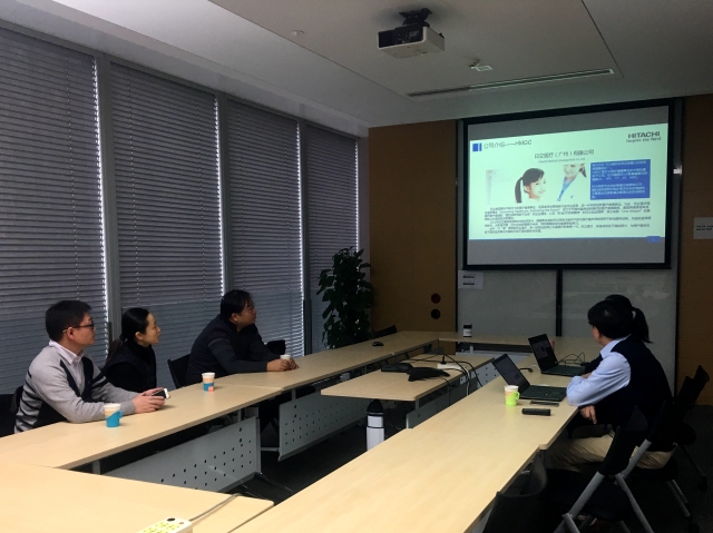 日立医疗(广州)有限公司上海分公司副总姚国新、售后部副总监王健对蒋书记一行的到访给予热情接待,他们表示此次合作交流活动将增进企业与学校间的相互了解,对促进校企合作起到了积极的作用。企业行政部负责人介绍了企业发展历程、企业架构和下属主要产品。王副总监展示了企业人才储备计划、实习生招募和培训的相关内容。蒋书记代表学院感谢日立公司对我校学生的青睐,表达了希望能够保持联系、加强合作的心愿,并诚挚邀请其参加由医学影像学院承办的全国医学影像技术职业技能大赛。