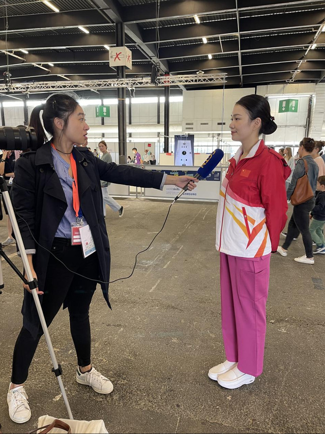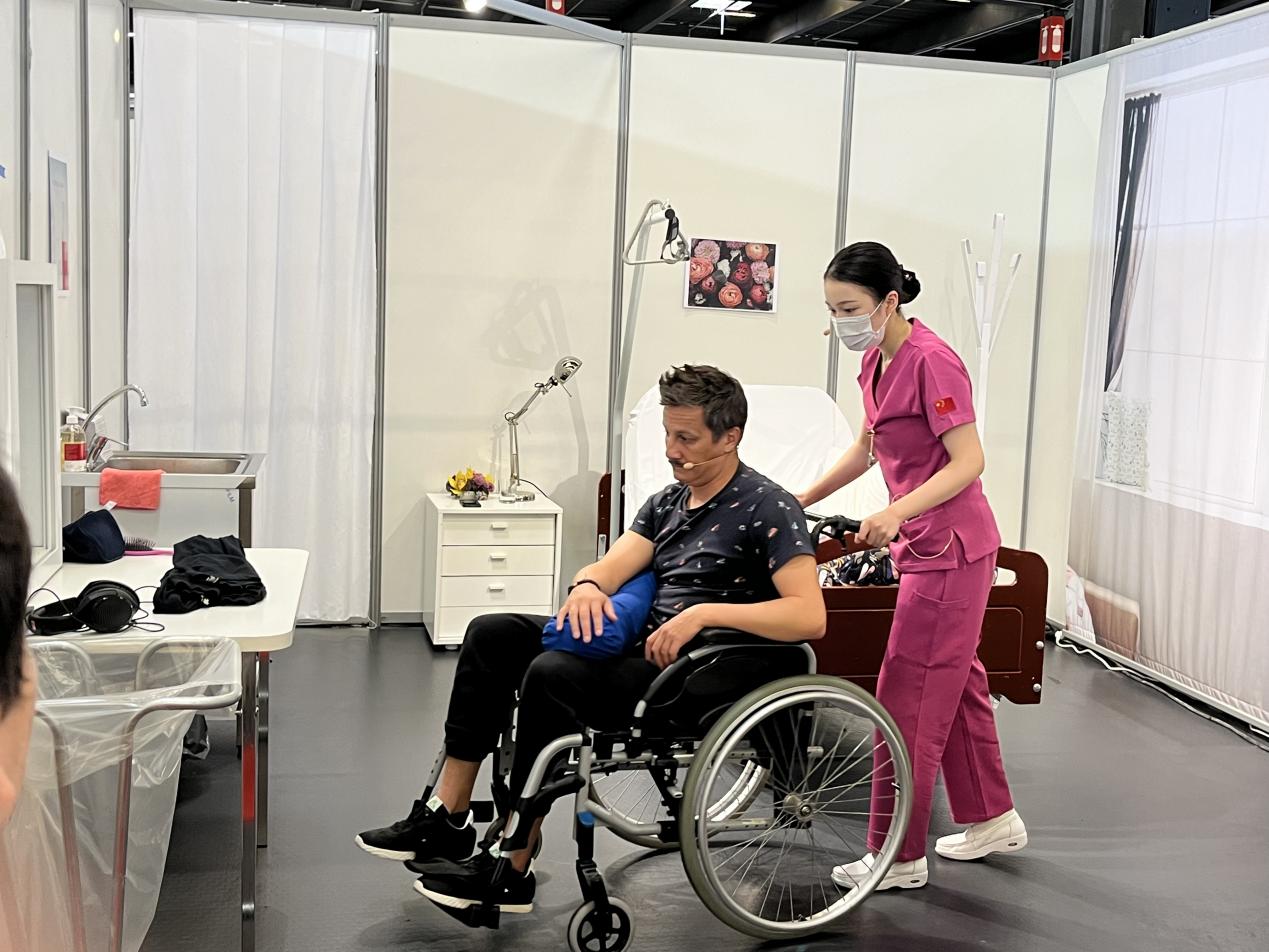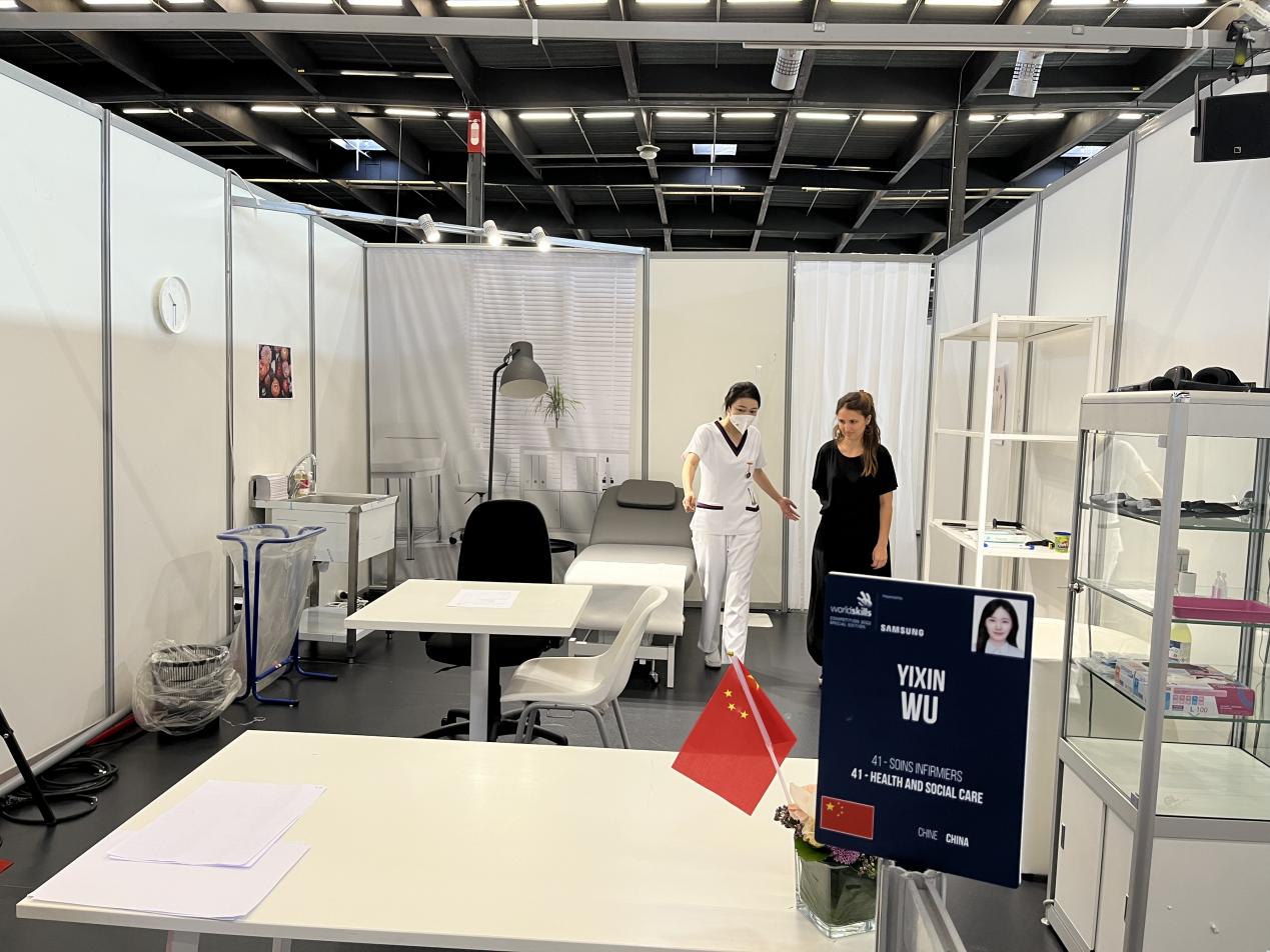 在2021年健康和社会照护项目国家队首次阶段考核中,吴怡欣老师以第一名的成绩获得了参加2022年世界技能大赛特别赛的入场券。在前期训练的基础上,针对公布的赛题,由专家组长、专家、教练组成的备赛团队进行了为期100天冲刺集训,在牵头基地上海健康医学院和河南医药健康技师学院、重庆市卫生技工学校、山东医药技师学院、黑龙江省林业卫生学校5个基地领导的大力支持下,组织了高强度的模拟考核,与其他国家专家、选手线上指导和集训,整装待发,出征法国。4天的比赛赛程,吴怡欣的16项工作任务安排相对均衡,分别是4、4、5、3项,赛前5天抵达波尔多的吴怡欣迅速调整,以最佳的状态投入比赛。赛场上的吴怡欣技艺精湛、温暖关爱、笑容灿烂、自信满满……面对膝关节术后伤口疼痛的病人,她用专业的技能缓解病人疾病带来的痛苦;面对不想让妈妈离家上班的唐氏综合症女孩,她用甜美的歌声安抚了女孩无助的焦虑;面对车祸后截肢的空姐,她用倾听、理解和支持给予病人强大的力量;面对找不到自己房间阿尔茨海默症患者,她用智慧和温暖帮助病人找回深藏内心的那份珍贵;面对重度偏瘫失望无助的病人,她用精湛的技术和耐心的关爱帮助病人重拾信心。吴怡欣赛场上的优异表现赢得了标准化病人的啧啧称赞,赢得了裁判专家的高度认可,赢得了围观观众的阵阵喝彩。同时吸引了国内外各家媒体的采访和报道。