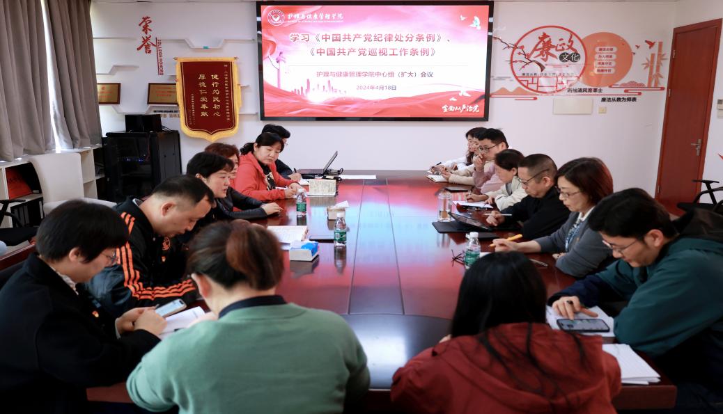 为深入学习贯彻习近平总书记关于党纪学习教育的重要指示精神,传达中央、市委、市教卫工作党委、校党委部署要求,推动学院党纪学习教育开好局、起好步,4月18日下午,护管学院党总支召开中心组学习(扩大)会,校党委副书记唐红梅出席了会议,全体中心组成员和各支部委员共同参会。会议由学院党总支书记郭戎静主持。