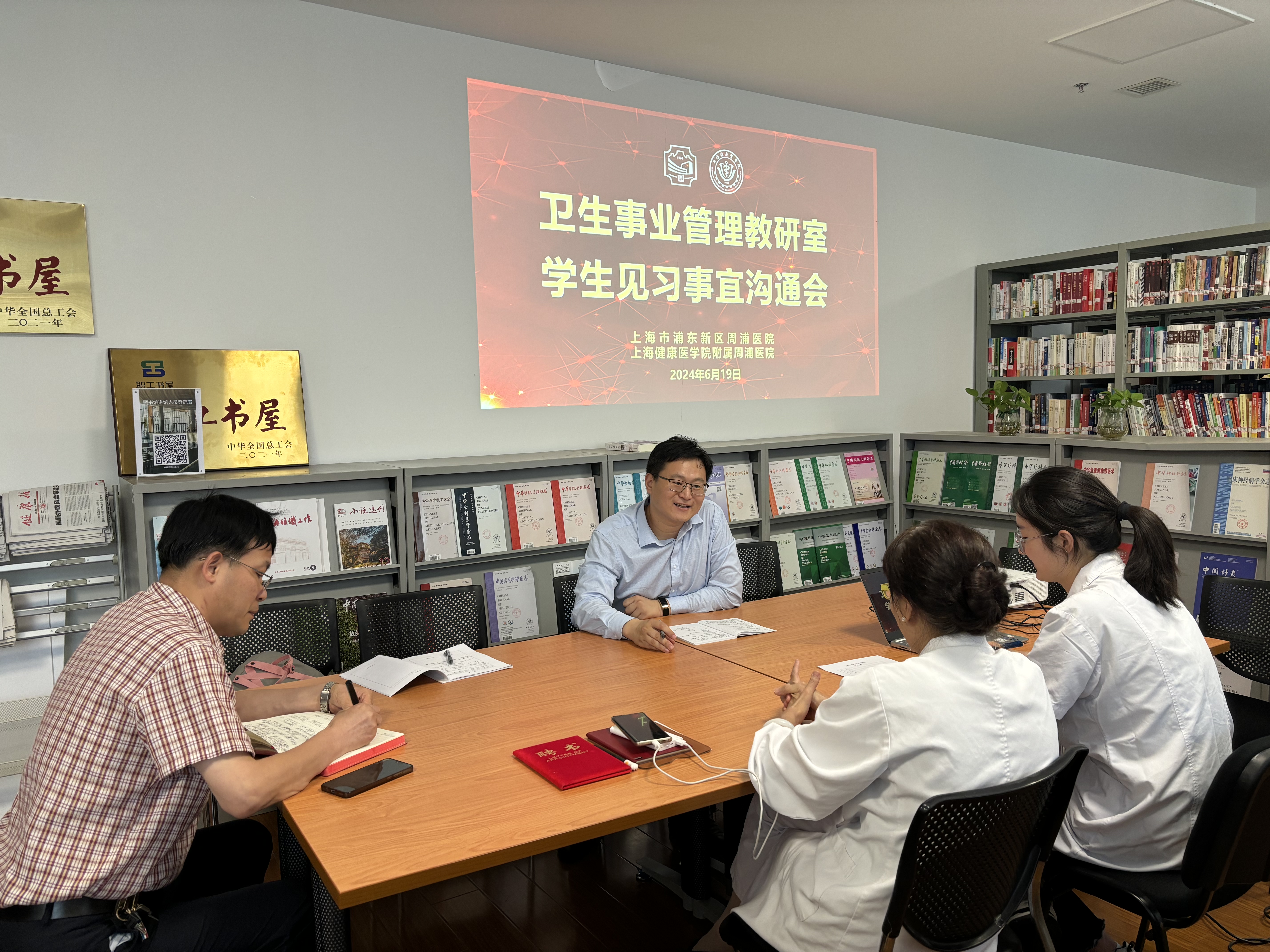建校以来,学校紧紧围绕医疗卫生事业发展和高水平医疗卫生应用型人才需求,立足上海,辐射长三角,服务全国,对接建设“教育强国”和“健康中国”战略,坚持“应用型、特色性、国际化”办学定位。公共事业管理专业作为我校2020年新招生本科专业,以培养能够在各级各类卫生健康公共组织从事管理工作的高素质、复合型、应用型人才为己任。为进一步优化专业实践教学体系,提升实践教学质量,加强与行业交流联系,6月19日下午,健康与公共卫生学院公共事业管理专业主任王欣国、青年教师李坤前往附属周浦医院卫生事业管理教研室研讨《临床实践》和《医院管理实践》两门实践课程建设优化方案。附属周浦医院副院长、卫生事业管理教研室主任钱巧慧,教学部主任杨涛,科研部副主任赵璐明参加了此次交流。