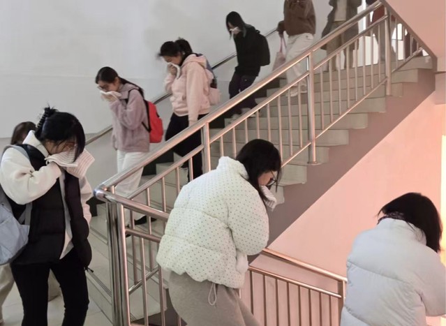 中午11点50分,警报拉响,消防逃生演练正式开始。南苑W楼内模拟浓烟迅速弥漫至各楼层走廊,逼真还原了火灾现场的紧张氛围。教室内的师生闻声而动,在现场工作人员的引导下,迅速用毛巾捂住口鼻,保持弯腰低姿安全姿势,按指定疏散路线快速、有序地向楼外撤离。仅用时两分钟,近百余名师生安全转移至W楼北广场的指定集合区域,实现了“零拥挤、零疏漏”的疏散目标。