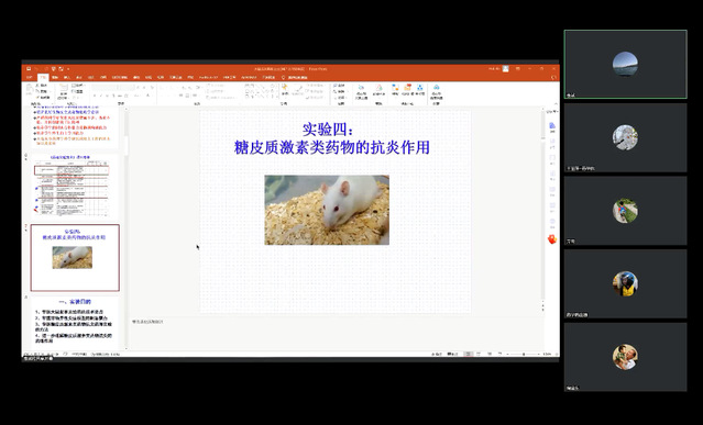惠斌副教授主讲《药理学实验技术》,本次授课主要是讲授了糖皮质激素抗炎作用的实验方法,我们主要是结合多种的教学手段,包括视频演示等方法来提升学生对。糖皮质激素抗炎作用的实验方法的理解和对一些实验操作的技巧及注意事项的注意,通过这个来培养学生以今后从事相关的科学研究奠定一定的基础。