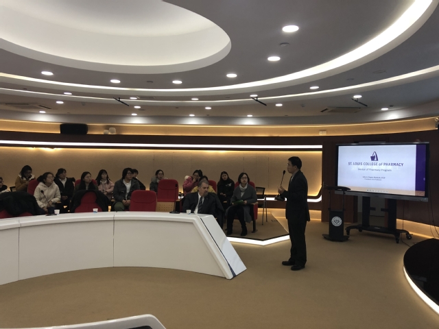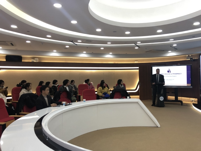 2月25日晚,美国圣路易大学药学院(St. Louis College of Pharmacy)院长John Albert Pieper博士、美国伊利诺伊大学药学院(University of Illinois at Chicago, School of Pharmacy)国际部主任Alan Lau博士等一行在华山医院药剂科钟明康主任陪同下,来我校面向药学专业本科生及研究生开展药学博士(Pharm.D.)项目的培养交流活动,旨在帮助国内大学药学专业学生更多了解或熟悉美国大学药学博士培养路径,为国内培养更多药学人才,特别是临床药学高级人才。