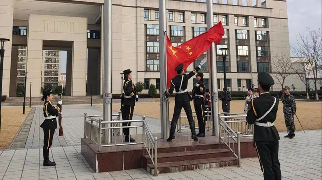 2022年1月1日8时,迎着东方的晨曦,怀着赤诚的敬意,伴着庄严的乐曲,上海健康医学院国旗护卫队迎来了新年的第一次升旗仪式。