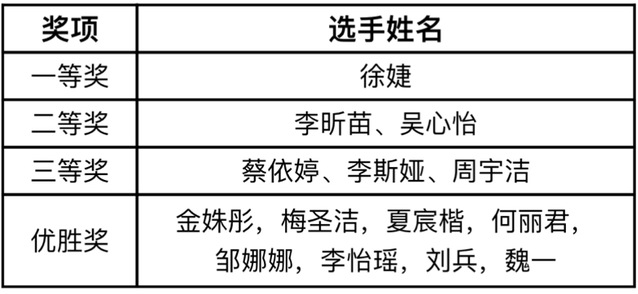 经过激烈角逐,大赛评比出一等奖1名,二等奖2名,三等奖3名,优胜奖8名。杨越旺、施春燕、臧娴等6名老师获得“优秀指导老师”荣誉称号。