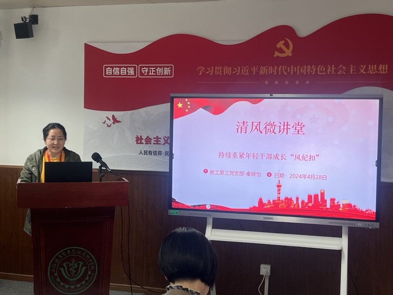 教工第三党支部纪检委员秦晓怡作学习交流。秦晓怡以“持续系紧年轻干部成长‘风纪扣’”为题,以年轻干部成长和教育为切入点,结合党纪学习教育,阐述了作风建设的重要性,表达了年轻党员干部要坚定理想信念,坚守纪律底线,紧绷思想弦,严把作风关。