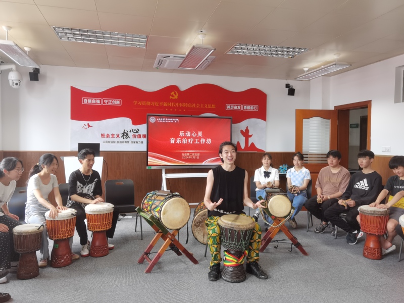 7月1日下午,心理健康教育中心在二教608室开展了“乐动心灵—音乐治疗工作坊”,旨在通过音乐去感知情绪,在演奏中释放内心压力,从而达到音乐疗愈心灵的目的。此次工作坊由传统非洲鼓JAMMALA乐队马迎明老师带领,共有14名教师和20名学生参加了此次团体活动。