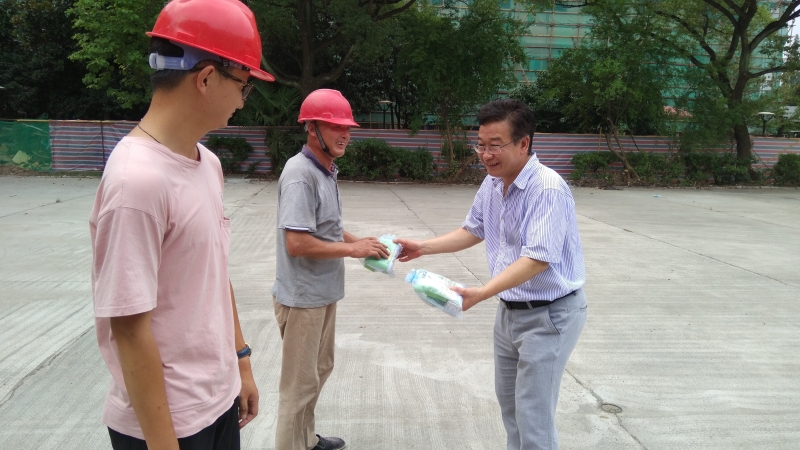 张道方副校长来到施工现场,为他们送上了清凉防暑用品。并与施工人员亲切交流,关心他们的施工情况,感谢物业、安保、食堂、超市的员工为配合基建施工的默默付出。张道方副校长叮嘱施工单位现场负责人合理安排工作时间,注意防暑降温、施工安全为第一要务。