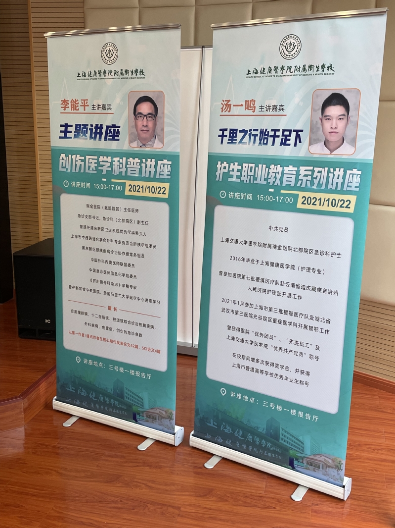 2021年10月22日下午,护理专业班导师组邀请瑞金医院北部院区急诊科李能平主任医师和我校优秀毕业生、急诊科护士汤一鸣来我校为护理系学生开展讲座,使学生了解了基本创伤急救知识,以及如何胜任急救护理工作,20级护理中高职和中职学生聆听了本次讲座。