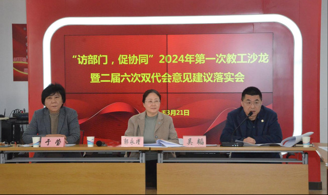 2024年3月21日,“访部门、促协同”2024年第一次教工沙龙暨二届六次双代会意见建议落实会在北苑1号楼500室成功举办。党委书记郭永瑾、党委副书记、校长吴韬、校党委副书记、工会主席于莹,相关职能部门负责人、提案工作小组委员和教师代表三十余人参加会议,会议由工会常务副主席凌文惠主持。