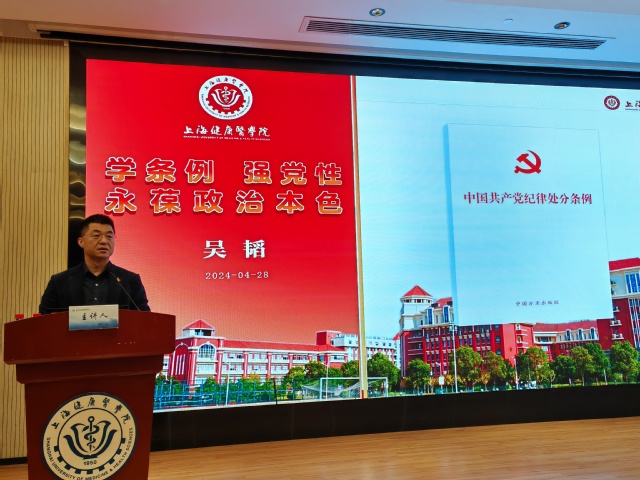 吴韬围绕党纪学习教育要求,重点聚焦《中国共产党纪律处分条例》,从四个方面展开。一是认清意义,在学习教育中提升“政治定力”。通过系统梳理党史中的党纪建设,学习领悟党的十八大以来习近平总书记多次就开展党纪学习教育发表的重要讲话和作出的重要指示。要求大家充分认识到此次党纪学习教育是加强党的纪律建设、推进全面从严治党向纵深发展的重要举措,要更好地认清我们党的历史使命和时代责任,提高政治站位,增强“四个意识”、坚定“四个自信”、做到“两个维护”,不断提升自身的政治定力。二是回归原文,在入脑入心中提升“纪律定力”。结合《条例》的修订情况、主要内容、具体条款,就政治纪律、组织纪律、廉洁纪律、群众纪律、工作纪律和生活纪律作了系统阐述,对条例中新增和修订条款进行了重点解读,结合警示案例和工作实际,深入浅出地和与会党员交流了学习体会。强调党纪学习教育要抓住重点,深入学习领会党的章程、纪律和规矩,严守党的政治纪律和政治规矩。三是慎初慎微,在清风正气中提升“抵腐定力”。从跳出历史周期率的“第一个答案”和“第二个答案”出发,认真领读今年“两会”中的“两高”报告,使大家充分认识到,反腐败永远在路上,必须坚持以雷霆之势反腐惩恶,要永远吹响冲锋号。作为党员,在日常工作和生活中,要慎初慎微,时刻警醒自己,始终保持清醒头脑,守住底线,不越红线,积极营造清风正气的生态环境,推动学校各项工作健康有序高质量发展。四是担当作为,在干事创业中提升“道德定力”。指出党纪学习教育要与学校中心工作紧密结合起来,切实增强纪律修养,锤炼坚强党性,防止“两张皮”,将党纪学习教育要求作为学校各项事业发展的支撑保障。党员同志们要立足本职工作,聚焦2024年学校工作要点中七个“踔厉”,以系统观念为统筹,踔厉推进新一轮教育综改;以立德树人为根本,踔厉深化应用型人才培养;以人才强校为核心,踔厉打造高水平卓越队伍;以科研创新为动力,踔厉锚定大健康战略需求;以提升服务为关键,踔厉开辟医学教育新赛道;以合作交流为支撑,踔厉实现国际化内涵拓展;以治理升级为基础,踔厉推动学校高质量发展。勇于担当、敢于作为,把对党的忠诚落实到具体行动中,全心全意为师生服务,不断推动健康事业高质量发展。