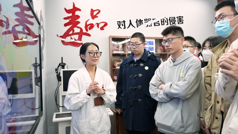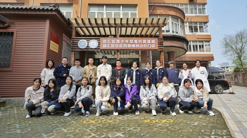 首先,医生向大家介绍了徐汇区禁毒门诊开展的学术交流以及帮助吸毒人员的特色活动,并展示了门诊中的吸毒成瘾认定点。门诊的花园中挂着向青少年征集的禁毒科普绘画作品,展现了不同年龄段的青少年对毒品的不同认知。随后大家参观了徐汇区青少年禁毒科普基地的示教室,示教室中展示了海洛因、大麻、冰毒、摇头丸、“奶茶粉”等毒品的仿制品,帮助同学们对各种毒品的外观有所警惕。此外,毒品导致牙齿、心脏、肺部等内部器官病变的人体模型使同学们对毒品的深重危害有了非常直观的认识。医生介绍了门诊的VR康复设备,通过条件反射原理使吸毒人员对毒品产生厌恶,以达到戒毒的目的。接着医生重点介绍了对海洛因成瘾患者进行维持治疗的美沙酮门诊及其治疗流程,最后同学们参与了禁毒知识答题的互动环节。