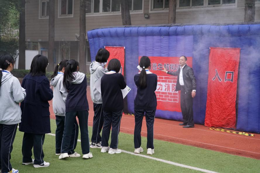 安全讲座结束后,学校副校长张建中宣布消防演练开始。全体师生参与了消防疏散逃生演练、灭火器使用演练、消防帐篷逃生演练,通过模拟真实火灾中逃生、灭火等场景,体验了火场逃生、消防灭火等防火安全知识与技能。