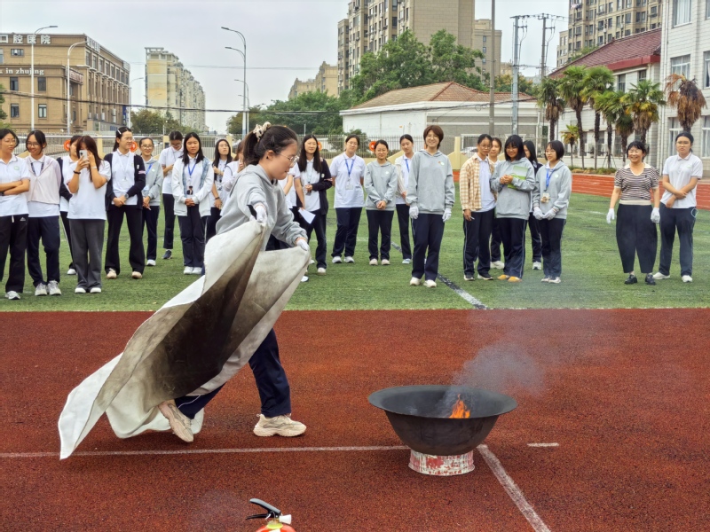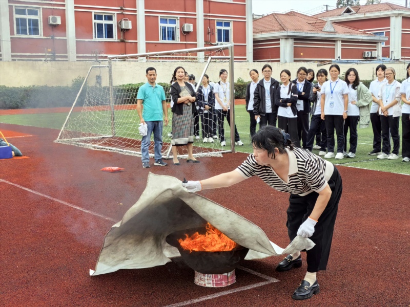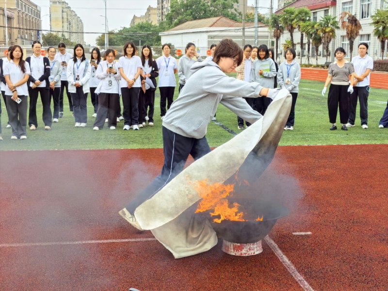 在理论培训结束后,全体人员移步至学校操场,参加灭火实战演练。现场模拟火点已然就绪,手套、灭火毯等专业消防装备一应俱全。总务科张志勇老师示范灭火毯的标准操作流程,细致拆解每个动作要领;寝室长、班主任代表与宿管人员轮番上场实践,在老师精准指导下掌握标准动作,安全扑灭火苗,学会了应急灭火技能。