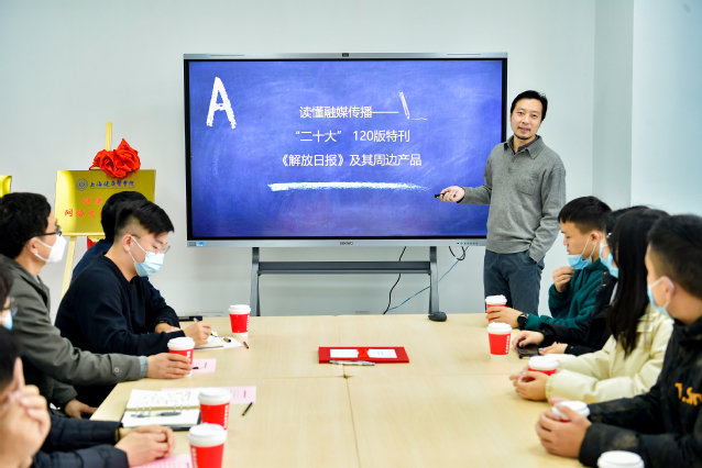 仪式后,举行了通讯员、新媒体管理员、网络舆情信息员、学生记者培训会。《解放日报》首席记者徐瑞哲作了题为《用好媒体融合,讲好校园故事》的报告,他以“二十大”120版特刊为例,详细介绍《解放日报》及其周边产品的创作过程,引导师生读懂融媒传播。“新闻最缺有故事的人,听长辈讲老物件故事,一具体,就生动”他还分享了自己采写几位百岁教授的过程和感受,采访的过程也是学习和提升自己境界的过程。现场做了互动交流。