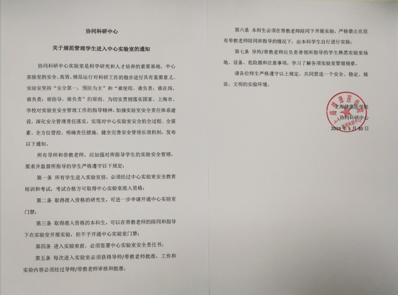 协同科研中心 关于规范管理学生进入中心实验室的通知