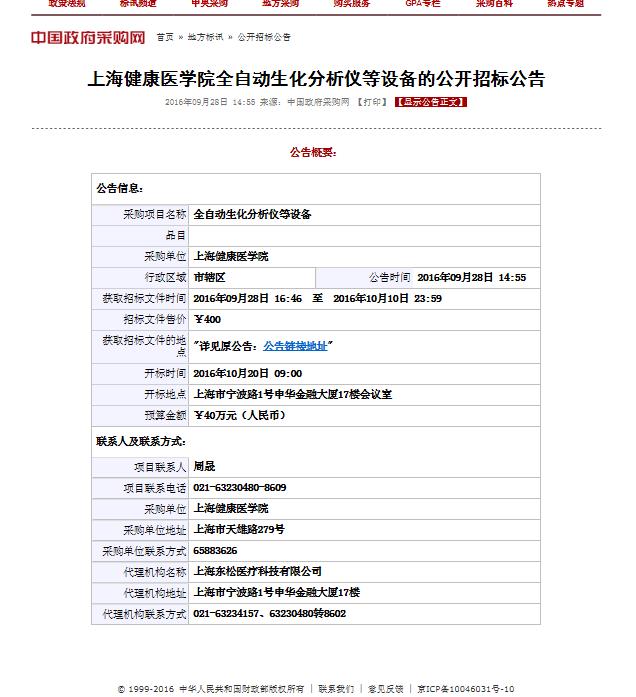 上海健康医学院全自动生化分析仪等设备的公开招标公告