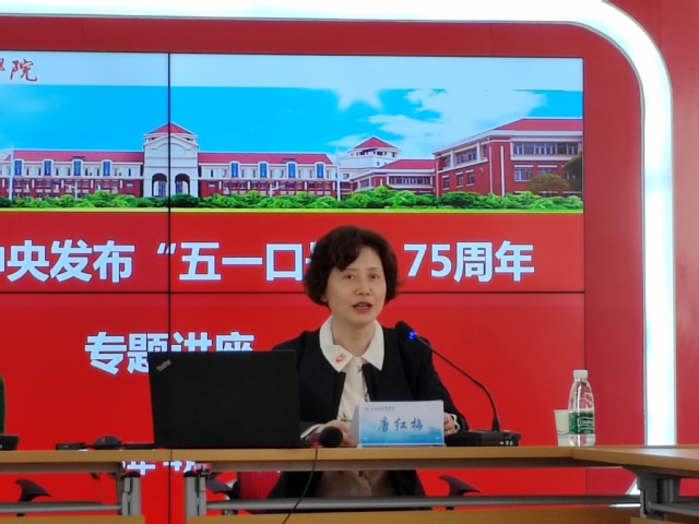 讲座伊始,唐红梅就举办此次专题讲座的意义和目的向各位参会人员作了介绍。她谈到学校党委举办纪念中共中央发布“五一口号”75周年专题讲座,目的是回顾各民主党派发展历程,总结各民主党派、无党派人士同中国共产党团结合作的光辉历史和宝贵经验,大力弘扬与党同心、爱国为民、精诚合作、敬业奉献的优良传统;同时,对于统战人士深入学习贯彻党的二十大精神和习近平总书记关于做好新时代党的统一战线工作的重要思想,深化主题教育在统战人士中的学习,夯实新时代多党合作共同思想政治基础,团结凝聚统战成员更加紧密地团结在中国共产党周围,同心同德,做好参谋、好帮手、好同事,具有重要的现实意义。她鼓励广大党外教职工要继承传统,把重温“五一口号”与深入学习宣传贯彻党的二十大精神结合起来,不忘合作初心,继续携手前进,立足本职岗位,在学校事业发展中主动担当作为,凝心聚力,团结奋斗,在推进建设特色鲜明的高水平应用型医学院新征程中做出新的更大的贡献。