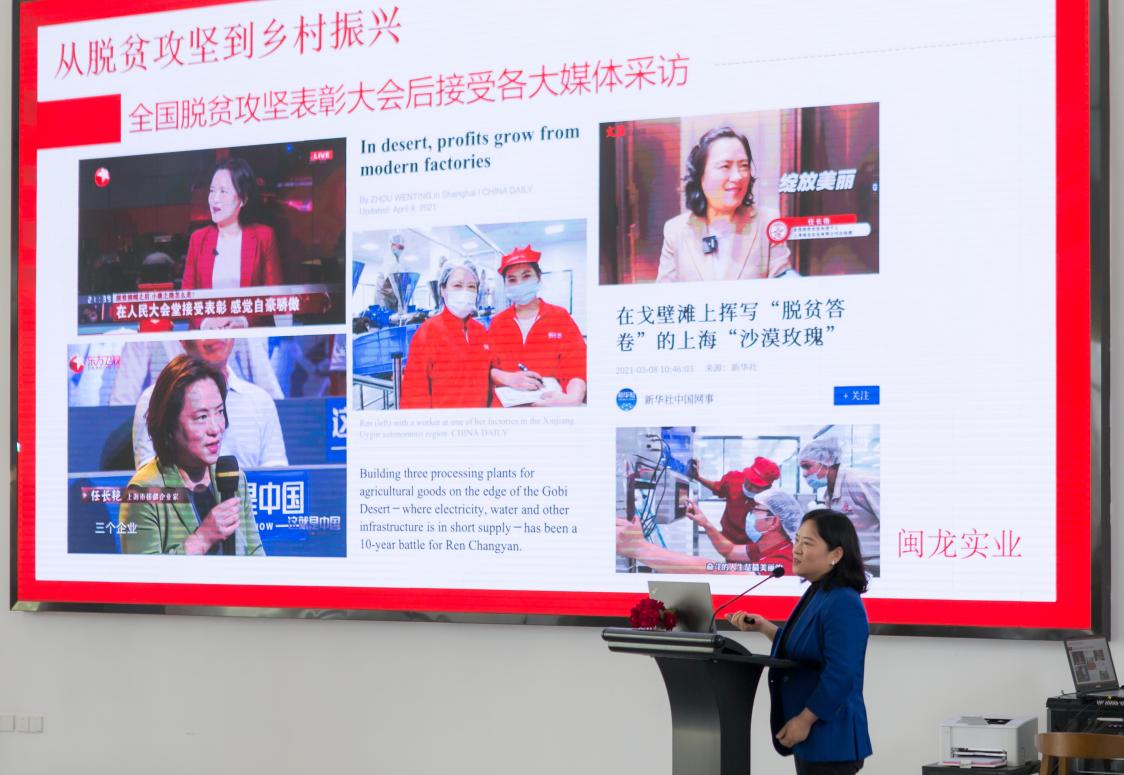 全国脱贫攻坚先进个人、闽龙实业总经理任长艳首先致欢迎辞并分享了脱贫攻坚的成效。闽龙实业作为农业产业化重点龙头企业积极发挥优势和作为,紧随乡村振兴的步伐,从南疆引进沙漠玫瑰在连民村种植,并以此为载体,打造了以玫瑰为主题的文创产业和品种研发中心,谱写了乡村振兴大文章。
