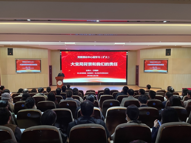 11月22日下午,上海健康医学院党委理论学习中心组举行专题扩大学习会,上海市公共关系协会会长,原上海市委常委、市委统战部部长,原上海市人大常委会副主任沙海林应邀作“大变局背景和我们的责任”专题辅导报告。全体在校校领导、全体中层干部、各二级学院教工、学生党支部书记、校民主党派正副主委、校知联会正副会长、专职辅导员参加学习。学习会由校党委书记郭永瑾主持。